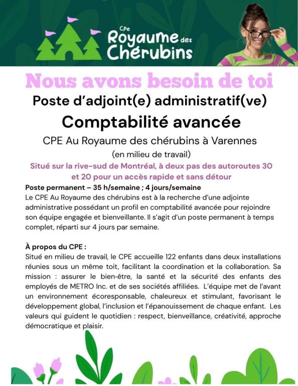 Le CPE AU ROYAUME DES CHÉRUBINS est un CPE en milieu de travail pour le siège social de Metro inc et ses sociétés affiliées.